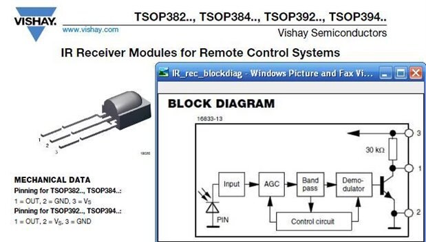 The Vishay TSOP38238 IR decoder has a block diagram as shown below: