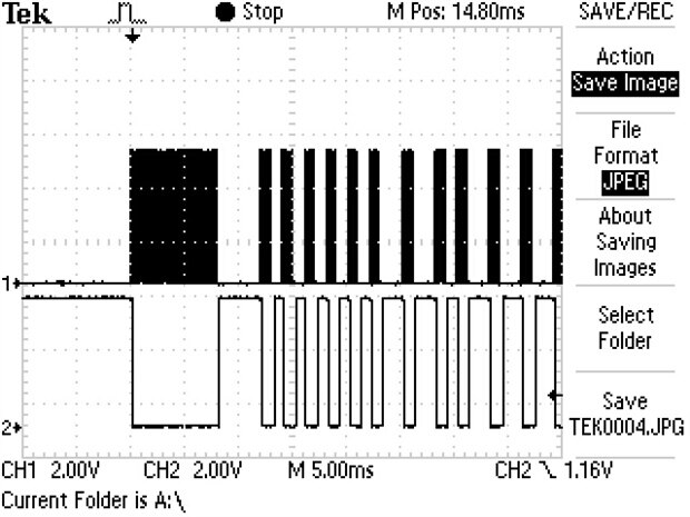 We can see now how logic "1" bits are encoded by having twice the spacing of logic "0" bits.