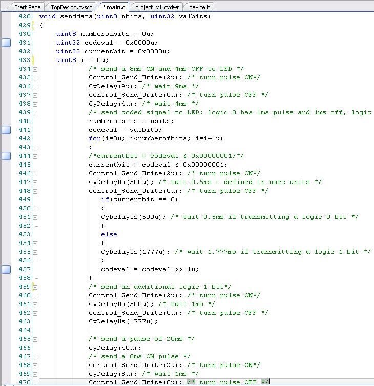 Another small challenge was the insertion of delay segments in the CPU code; previously I used the command CyDelay(…) but I had issues getting fine resolution of delay periods. After some search on the Internet I found out that I can use the command CyDelayUs(…) which then gave me higher resolution and this way I could “fine” adjust the infrared pulse widths to be recognized by the TV receiver.