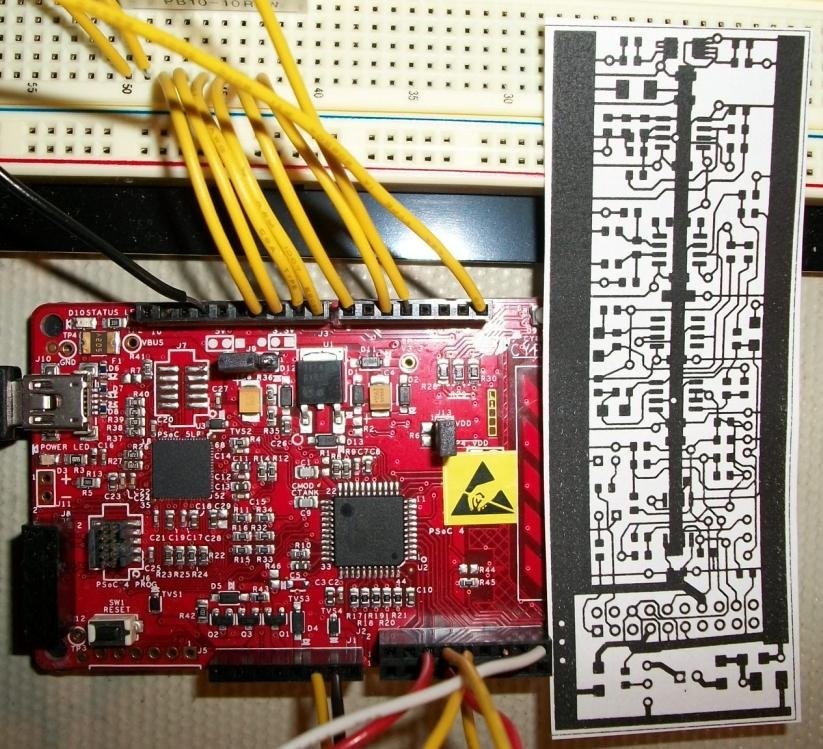 And here is a short video showing how I turned on the TV using this infrared transmission function implemented in the CPU of PSoC4 in the Pioneer kit. In this experiment I am using an emulator for the eyes movement (two push-buttons on the breadboard) since the experimental amplifier that I have previously shown in a video is now broken (I accidentally broke one pin of an integrated circuit on one of those “hanging” breadboards for who remembers that video). I didn’t want to spend time fixing it since the PCB board that will hold this front end amplifier is scheduled to be fabricated this week.