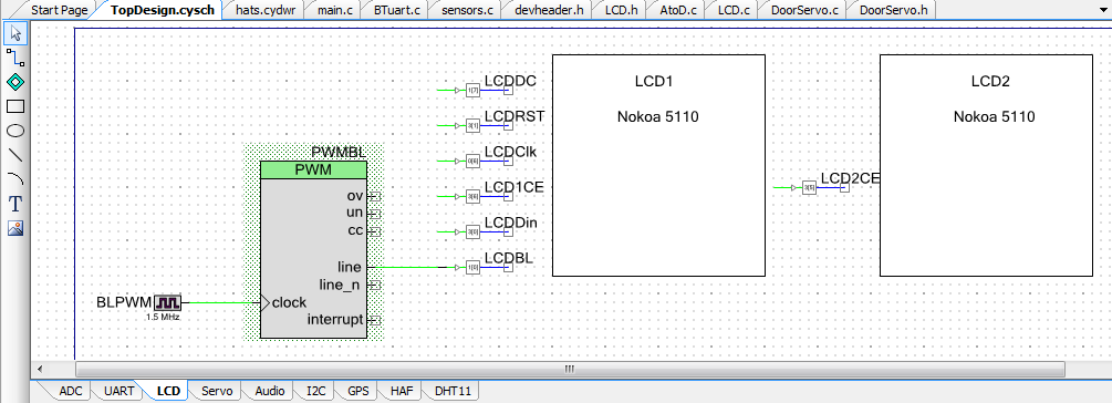 The LCD backlight LEDs take about 48 mA, which is too much for a digital output from the PSoC4, so they are driven by a PNP transistor mounted on the back of one of the LCDs. This transistor is in turn driven by a pulse-width-modulated (PWM) output from the PSoC4.