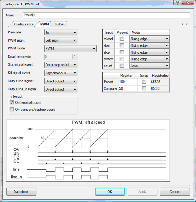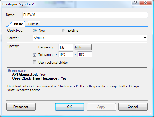 PWM is very easy to set up in PSoC Creator - these are the relevant screenshots.