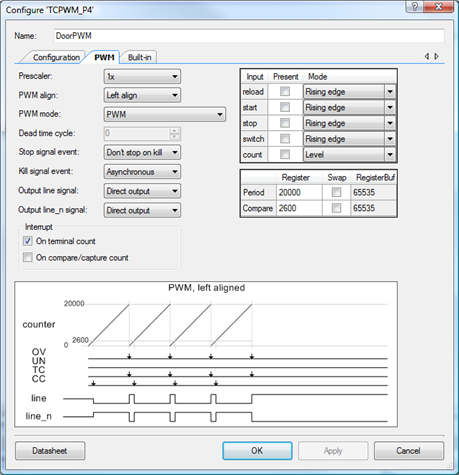 Servo motors for remote control use a standardized pulse width modulation scheme to control position. The pulse width can vary from about 1 ms to 2 ms with the centre position at 1.5 ms. The pulses occur at a nominal frequency of 50 Hz or about 20 ms from the start of one pulse until the start of the next pulse. Some motors don't hit their travel limits until 0.8 ms and 2.7 ms, but all of these pulse widths represent a fairly low duty cycle. The motor in this project has a useful range from 0.8 ms to 2.6 ms. With a 1 mHz clock, 2.6 ms corresponds to 2600 counts. Below are the relevant PWM set up screens: