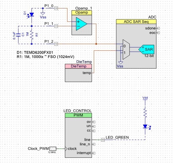 Hi all, here's a quick demo of a photodiode coupled to one of the psoc4 internal op-amps, in turn driving PWM'd LED. I've gone for the photodiode circuit for simplicity and small component size. It's also very low on power, essentially only drawing the light current of the diode itself, it's always good to deal with active power at a low level rather than rely purely on code-side power managment. Even though the sample rate and time (DC) of the light sensor will be low, keeping it's active power low will leave open opportunities to do extra things. I may want to have a mode where the device is sampling light more rapidly to detect not only state, but transition rate of light, for example when suddenly illuminated by the headlights of a car.