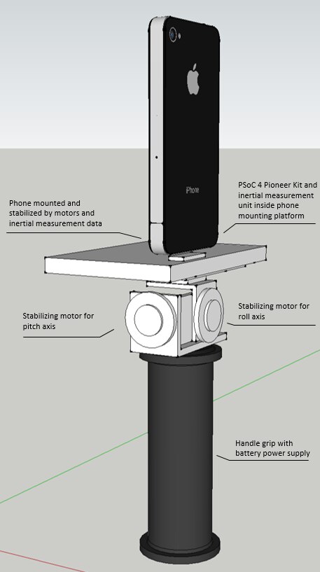 The device will be battery powered, small and lightweight. A video recording device is mounted on a mounting platform with two motors. The two motors allow the device to tilt freely in two separate axis. A sensor board with a 6 axis accelerometer/gyroscope IC will be mounted alongside the video recording device, sensing the inertial movements. The inertial movement data is then fed to the PSoC 4 Pioneer Kit, which will calculate the motor controls required to compensate for the jerky movements of the camera operator. This will provide stabilization for the video recording device, allowing video to be recorded without sudden jolts and shaking. The device will be fixed on top of a grip-like handle, allowing the gimbal and video recording device to be effortlessly operated. I made a Sketchup model of the device, seen below.