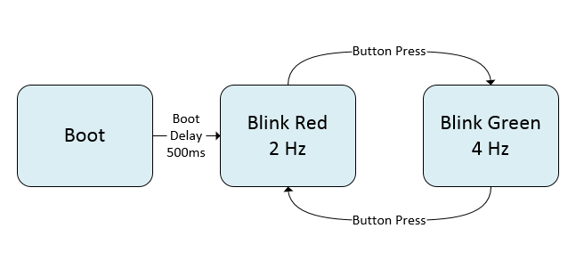 The program is fairly simple, but deals with inputs as well as outputs. The program has 3 states. It boots up, waits for half a second, and then goes into the red LED blinking state. In this state, the red LED blinks at a rate of 2 Hz. If a user button press is detected, the state machine exits the red LED blinking state and enters the green LED blinking state. The green LED blinks at 4 Hz. If the user button is pressed again, the program returns to the red LED blink state.