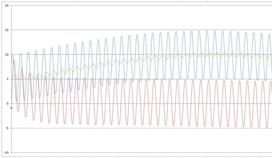 You are easily tell this is a case of the IIR since we are using previous output data (y[i – 1]). An FIR will use previous inputs, with not feedback from previous outputs. I decided to do a quick and dirty model of the filters on Excel. The Excel file is attached on this post. I didn’t have Matlab installed, so the only plot I have is the time domain response. Below is a screen shot: