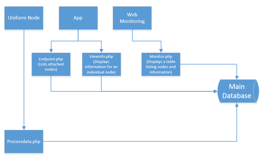 Processdata.php carries out the storage of the data into a MySQL database. It checks to see if a node with the same device ID has been registered - if it has, it will update the existing record. Otherwise, it'll create a new record.
