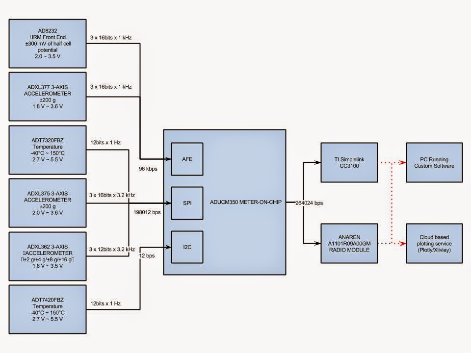 At the above calculated data rate of 264 kbps there was no real choice other than WiFi. While for a single player or even two players other options may be possible, for a full team the data rate quickly climbs above 1Mbps and only WiFi has a practical data rate above 3Mbps. While in theory the WiFi can handle the data rates for a team of players it is unclear at this point if the range needed to cover a hockey rink is possible. As the design moves forward this will be tested and hopefully resolved.