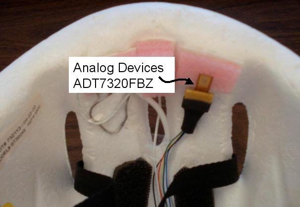 The body temperature is measured using the Analog Devices ADT7320, which is very small (4mm x 4mm) and it is mounted on the front inside the helmet, so that it touches the forehead. To ensure good contact with the skin, the ADT7320 sensor is placed on a layer of elastic sponge-type material. This implementation can be seen in the figure below: