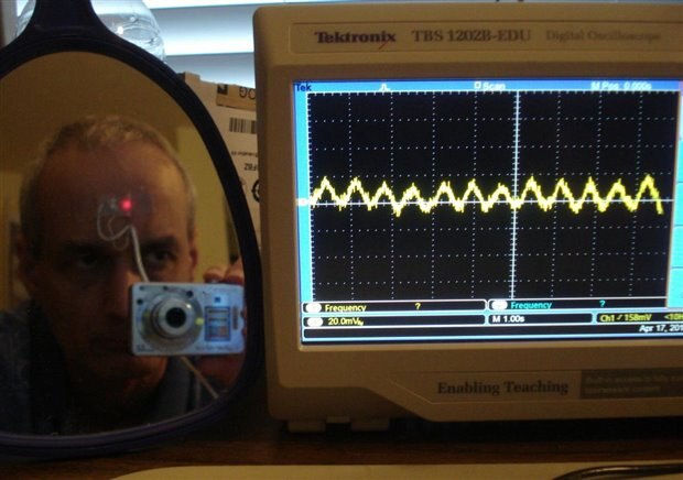 The signal contains the amplitude modulation generated by the heart rate. The prototype board can be seen on the right side of the picture, where the oscilloscope probe connects. Next I placed the LEDs and PIN photodiode on my forerhead and I measured the same signal at the output of the front end amplifier, as shown in the picture below.