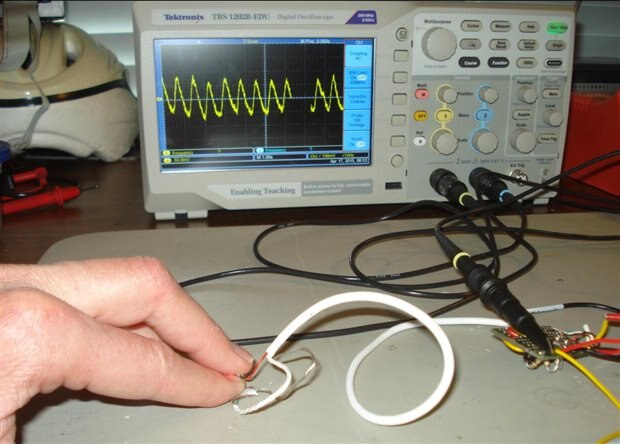 I implemented the schematic shown above using a solder prototype board and I then compared the measurements using the transmittance pulse oximetry on a finger and the reflectance pulse oximetry on my forehead. The picture below shows the amplifier output signal of the transmittance method measured with the Tektronix 1202B-EDU oscilloscope.