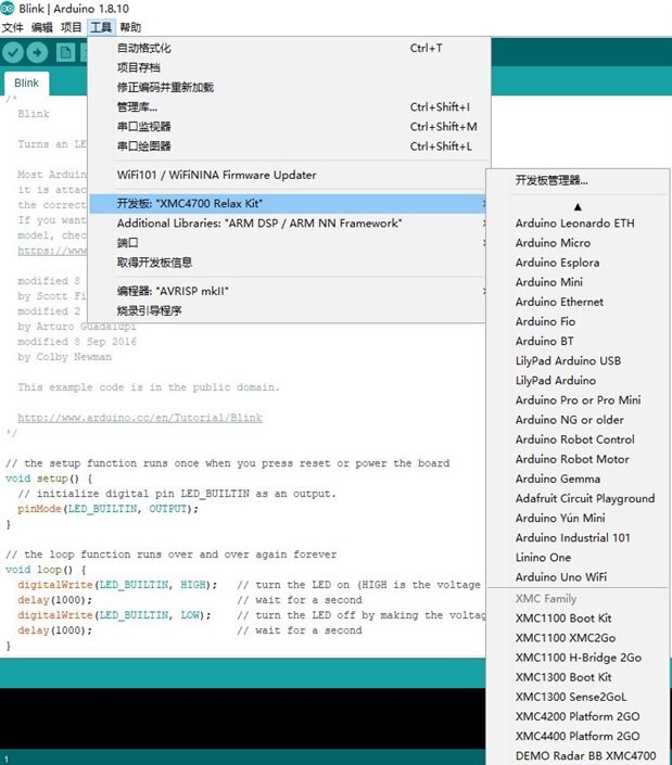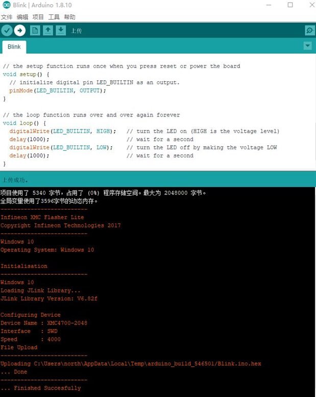 As kind of routine, start the blink.ino as first step using XMC4700 relax lite, build the code and download , the led blink every 1 second . It passes the first test.