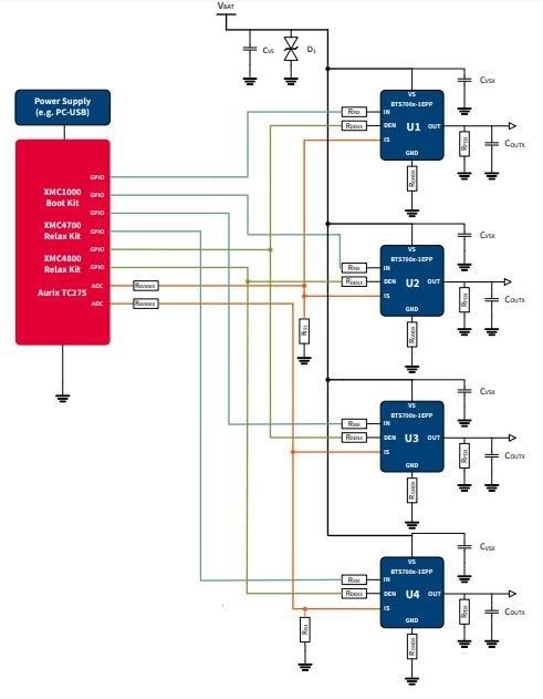 4800 Relax Kit from Infineon can be used as the master. y. Each one is built by a vertical N-channel power MOSFET with charge pump. Due to the integrated charge pump the channels can be controlled by standard digital IOs (3.3 V and 5 V supported). All of them are single channel devices with a very small ON-state resistance (e.g. the BTS7002-1EPP with one 2.6 mΩ channel)