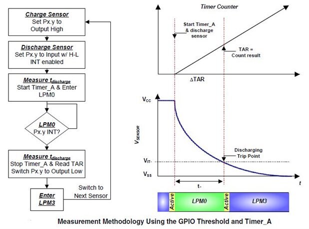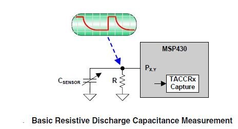 using an external resistor to charge or discharge the given capacitive sensor. Using the port pins of the MSP430 to charge or discharge the sensor cap, the internal Timer_A can be used to measure the corresponding charge or discharge time. Given a fixed external resistance to provide the charge/discharge path, the capacitance of the sensor can be measured. With reference design on MSP430,