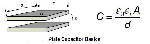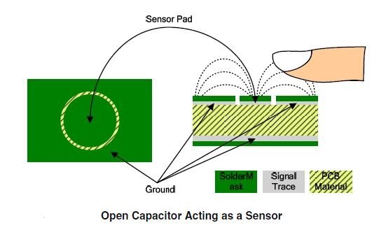2. The fundamental element required in the capacitive touch sensing application described is the variable capacitor itself. This capacitor should be easy to construct as well as sensitive to human touch in order to enable this as an alternative to mechanical buttons and switches. Such a touch sensitive sensor element can be constructed by “opening up” a capacitor structure so that the electric field can be interfered with by a conductive foreign object, in this case, a finger. The figure below shows the touch sensor.
