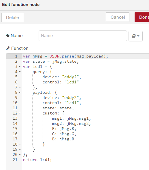 - The second node is the function node and this takes the message and creates an update query for the mongo. Looks like this:
