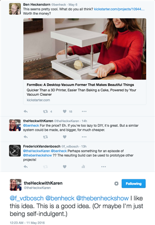 Ben was recently tweeting  about a new kickstarter campaign for a vacuum former. When makerkaren replied it should be possible to make it bigger and cheaper, I just had to ask ... : can you please build one on element14's The Ben Heck Show ?