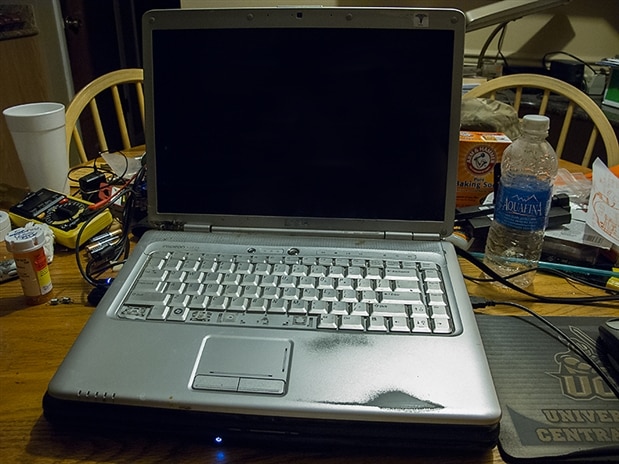 He offered up his GameBoy Advanced SP for parts (tiny screen and battery for a tiny handheld), but this busted up DELL Inspiron 1525 has a good screen and battery, and is prime for recycling. Instead of a handheld, we plan to transform the old console into battery powered unit which could be carried in a backpack.