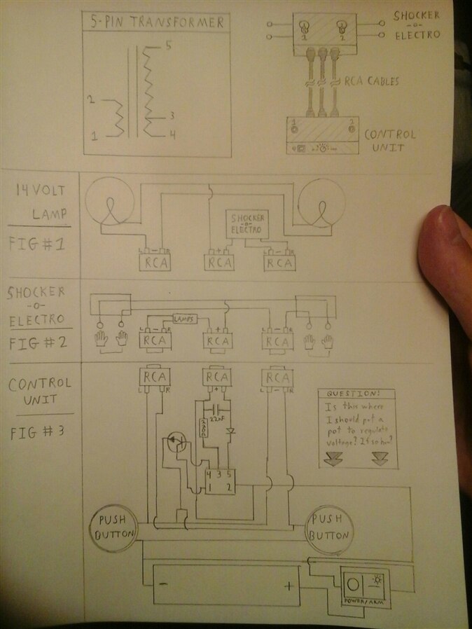I've modified some schematics from instructables so I can control who gets shocked and give a visual cue to the audience.