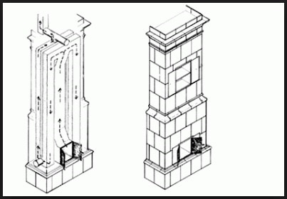 The smoke/warm air goes up, down on both sides, up on both sides and merges into the chimney. The outside is usually glaced ceramic tiles, on the inside brick and clay mortar. The clay mortar is necessary because when the stove gets warm, and its a lot of heat stored in the stove which can weigh up to 2000 pounds, the stove expands, an inch our so in circumference. The glaced tiles do not expand, but the space between them do. If normal mortar is used, the stove will crack. Its non-trivial to build such a stove.