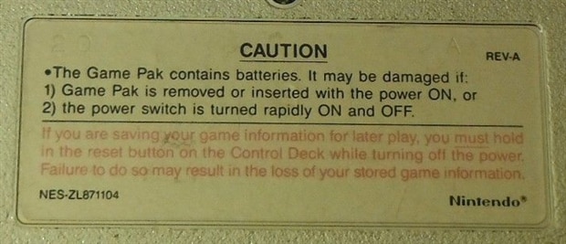 The Legend of Zelda was one of the few NES games that had battery-backed RAM in the cartridge for game saves, but on the back of the cartridge was this label with some... interesting instructions in red: