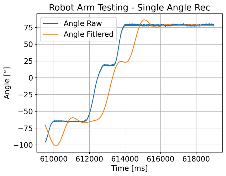 The signal is very noisy, especially when that joint is stationary. To battle that a bit, Milos did some filtering in Python, and from the recorded data, he generated a new CSV file with filtered signals. An example of how the filtering process worked for the signal shown above is shown here: