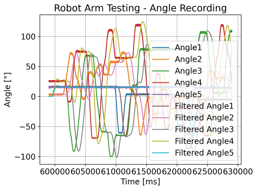 While the filtering for this case was a bit too strong, it doesn’t change the signal too much for a robot arm of this precision, so it’s a better fit than the unfiltered signal. He applied the same filtering algorithm to all of the axis, and this is the comparison of that for all of the joints at once.