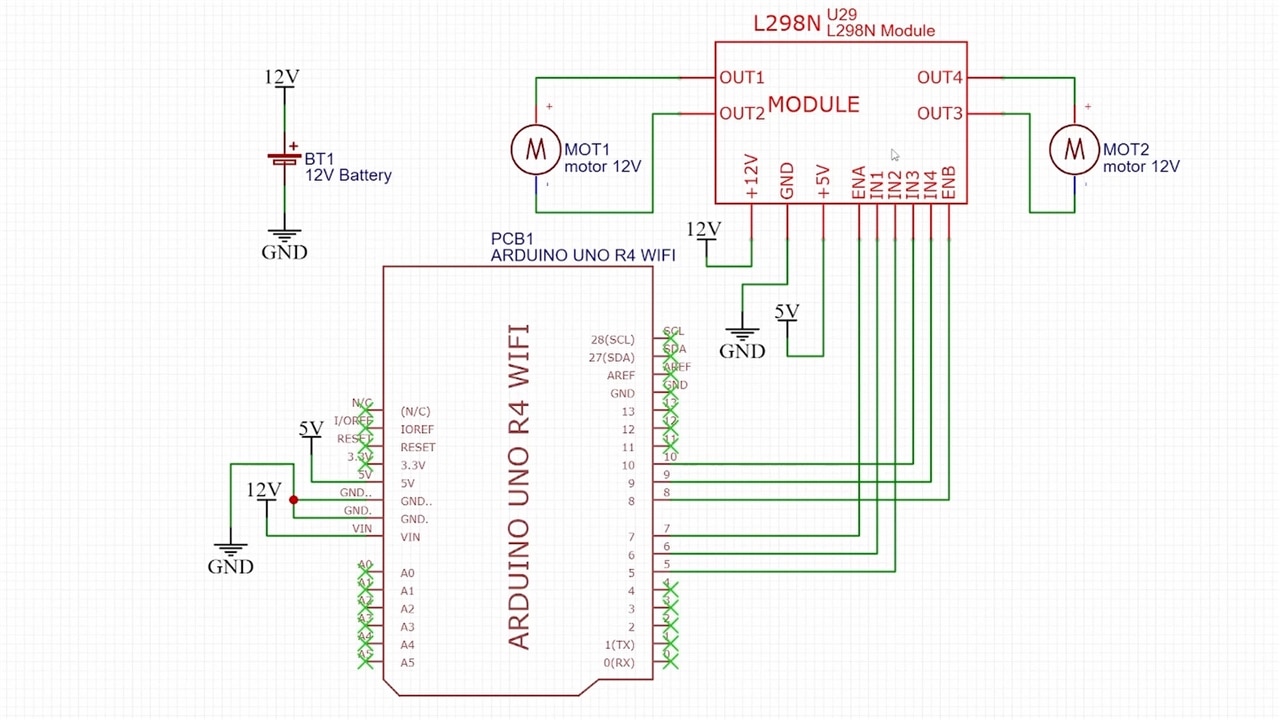 Since the whole idea was to keep it as beginner friendly and budget friendly as possible, the electronics are simple as it gets. Milos decided to use the new Arduino Uno R4 WiFi, since it has WiFi capabilities which are needed for the communication, and the L298N motor driver, which is probably the most widely available motor driver for hobbyists.