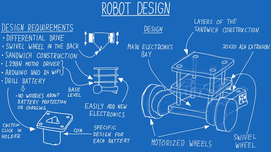 It’s a differential drive system with two wheels in the front and the swivel wheel in the back, and he decided that the body of the robot should have a sandwich style structure, so that levels can easily be added to the robot, which means we can easily add more electronics and sensors down the line! For powering the robot, to stick with the theme of the build, he went with a battery from his power drill, since that battery already has built in protection, and there is no need for making a new charger for it!