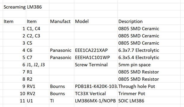 As noted in the video discussion of the PCB below, the main change I would make would be to increase pad sizes, especially of the trimmer used for gain. Bringing gain out to a full sized potentiometer and adding a potentiometer for bass boost could also be considered if board size is not a consideration.