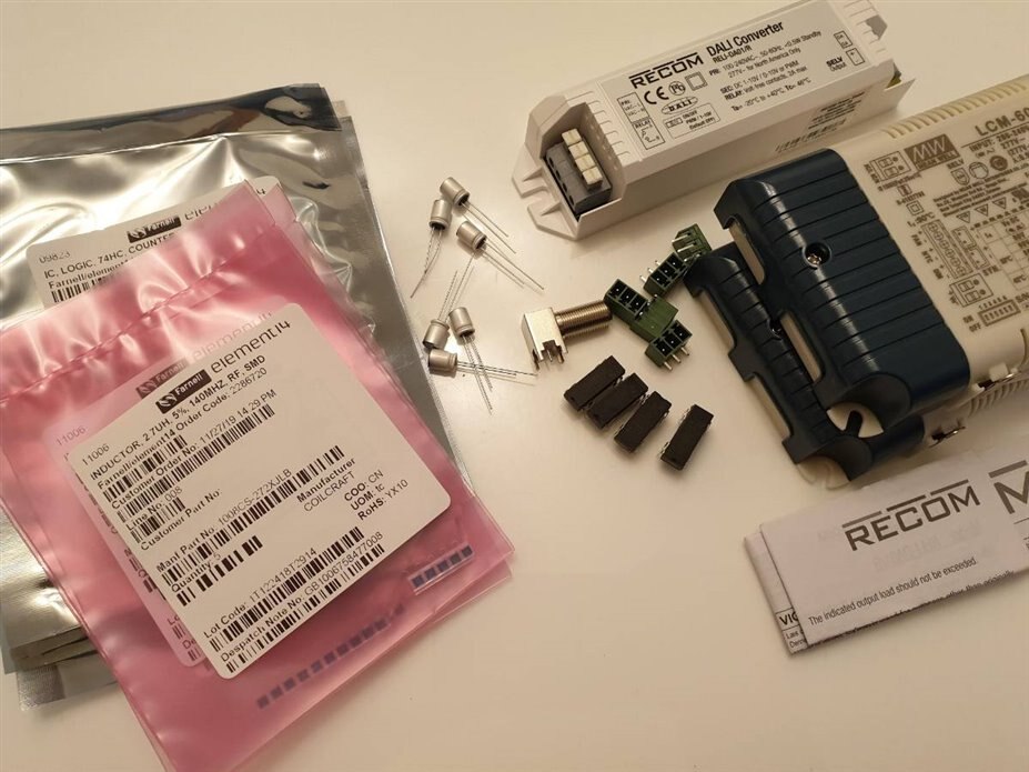 It is some lighting gear, miscellaneous semiconductors and some passives, and fancy tiny DIL-package relays.