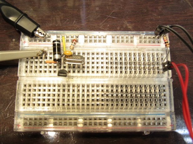 I checked my inventory and I had a 2N5459 which is an N Channel JFET so I was able to build the original circuit. It is amazing what a nice simple circuit it is. Here is my bread board with a 16 MHz crystal