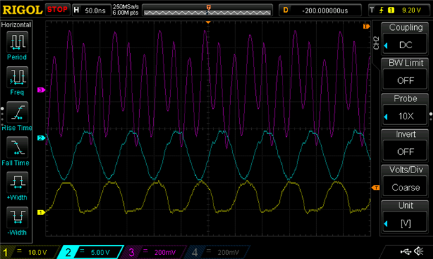 Powered from a 9 V cell with short leads. Both oscilloscope probes with pigtail ground leads.