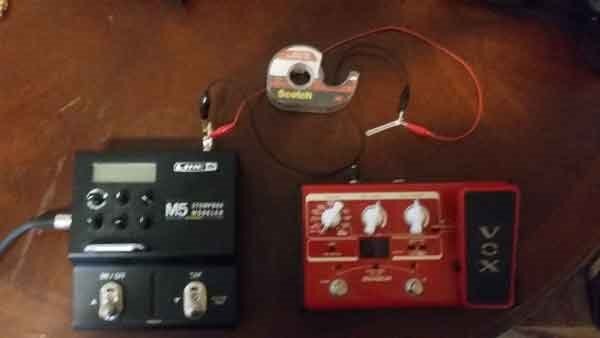 The next pic shows the effect units I will be using. The sensor will be taped under the Vox pedal to run the Line 6 unit. It could easily be wired to a proper 1/4'' on the Line 6 end for long term use but this theme got me thinking of a number of other ways to do this that I want to try as well.