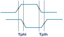 The propagation time is normally defined within the data sheet for the logic gate selected; however, it will often list two propagation times: one for the high to low transition and another for the low to high transition. Of course, the propagation time will also be affected by the ambient temperature, changes in power supply conditions, resistance of the driver, and the capacitive load on the device output.