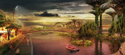 This unique botanical installation is comprised of 3 main sections; two conservatory domes that replicate exotic climates and house a diversity of plants of high conservation value, a great lake, which serves as a filter and irrigation source plus a forest of artificial trees that capture solar energy.