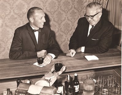 George C. Devol (right) and Joseph F. Engelberger (left) served by a Unimate robotic arm (lower center) (via the estate of George C. Devol)
