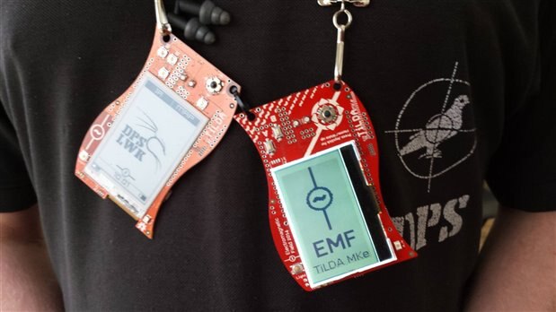 EMFCamp 2014: Two prototype EMFCamp Badges |
