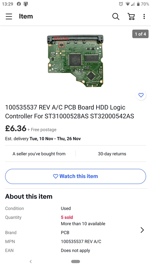 For many years I kept hold of a computer hard drive that had died on me, of all things the microcontroller on the control board blew itself up. I had looked for a replacement control board online and at the time they cost £100+ because this was such a common problem, however recently I looked again and found that it was on ebay for £6, with a 50/50 chance of being the wrong model.