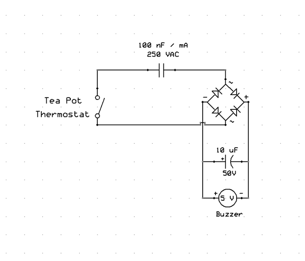 I want to add a buzzer that will make sound when it's done cooking. My plan is to take the voltage that will be across the temperature-controlled switch. I'll have a capacitor in series to drop the voltage, and a full-wave rectifier to make DC to power a 5v or 12v buzzer.