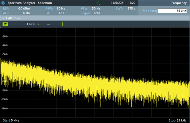With no input signal I am seeing what I feel is an unexpected response below 2.5 MHz. I will attach some pics to demonstrate. I first noticed this on powering up or on a preset a yellow line spike can be seen on the far left of the screen going all the way to the top of the screen. This is there but hard to see in the screen shot. When the frequency span is adjusted it is clear that the noise floor rises rapidly below 2.5 MHz. (see pic #2) The data sheet indicates a 5 KHz - 3 GHz operating bandwidth. I have gone through some of the specs and it seems otherwise to be operating within them. Am I seeing a normal and expected behavior or is there an incorrect setting or something misbehaving? Lowering the BW limits do improve this but there is still a sharp rise approaching 5 KHz. rise . Perhaps this is a just a firmware glitch? (Firmware v1.60)