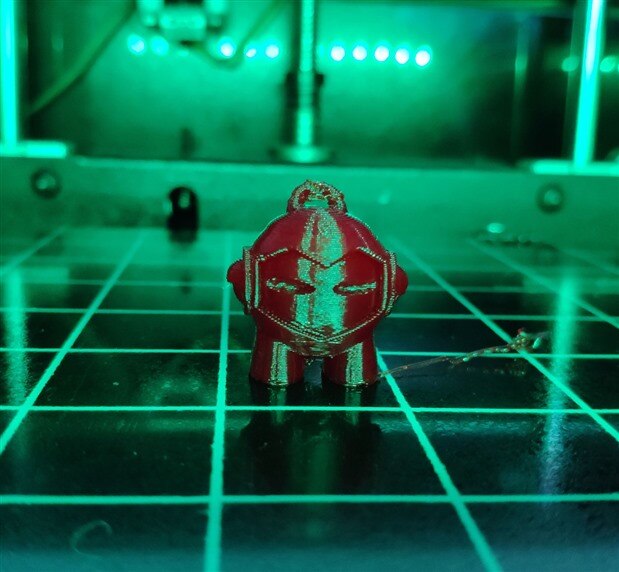 and here's the result (0.2, 20% infill and 60mm/s) PETG translucent RED (and I set settings in Slic3r for PLA - I though that was what I had in the printer