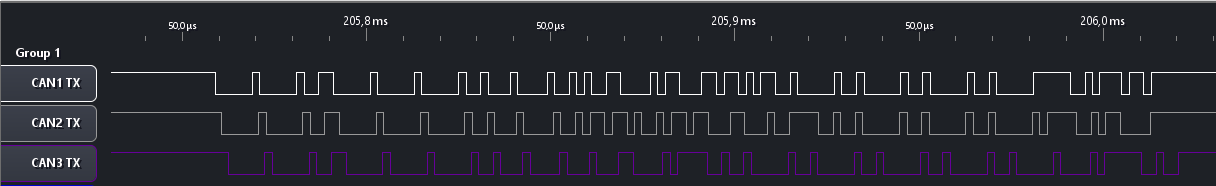 I'm trying out basic CAN communication on a Hercules microcontroller. This first test is to test an example project. Four CAN modules send an 8 char message out to themselves (so that we don't need external hardware).