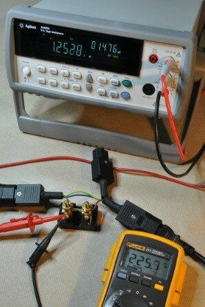 In our test, the red measurement clip was moved from the shunt sense terminal to the mains source on the socket strip. So we have added a potentially large value of Wire1Resistance to the shunt resistance RSense. The circuit passed through 3 metres of cable and 3 connectors that add contact resistance in series with the shunt.