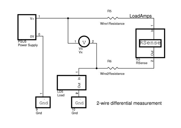 This is quite an extreme example but it does show the danger of using 2-wire measurements with a current sense resistor. If for some reason you have to use 2-wire measurement because you cannot afford to run the extra wires then you need to make the value of RSense >> than the Wire1Resistance (or Wire2Resistance if it is also significant.) For example, we could us a 2.5R resistor for RSense, then the wiring error is only 10% and we might accept that. There are other trade-offs, there will be power dissipation of 52X2.5 = 62.5W so we need to choose a component for RSense rated for say 100W on a heat-sink. Also there will be a volts drop of 12.5Vac at the load.