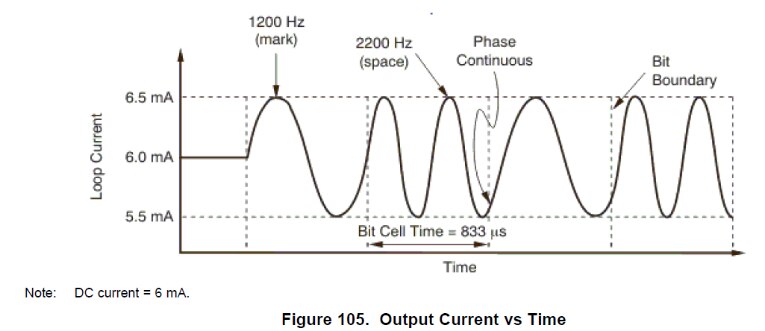 In essence, it accepts a sinusoidal signal of 0.5 Vpp, either 1200 or 2200 Hz, and translates that in an AC current component on the output of 1 mA
