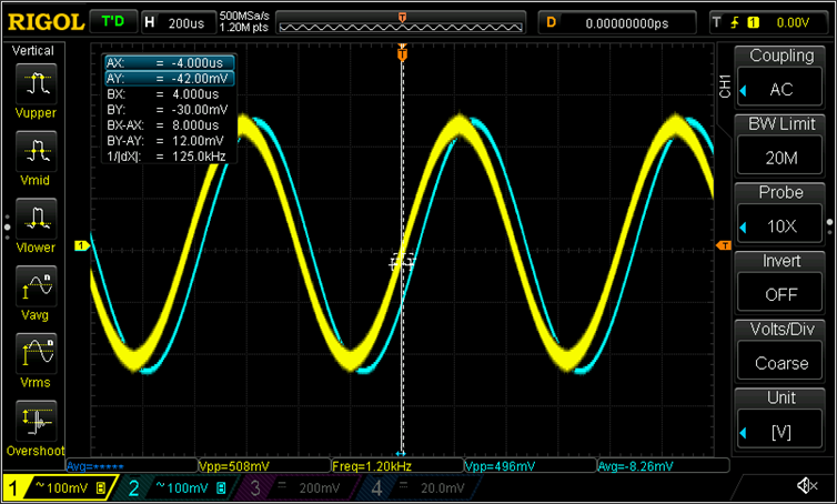 The yellow signal is the HART input, generated by the function generator. It's 500 mV, 1.2 kHz.