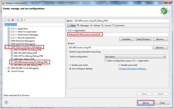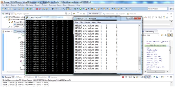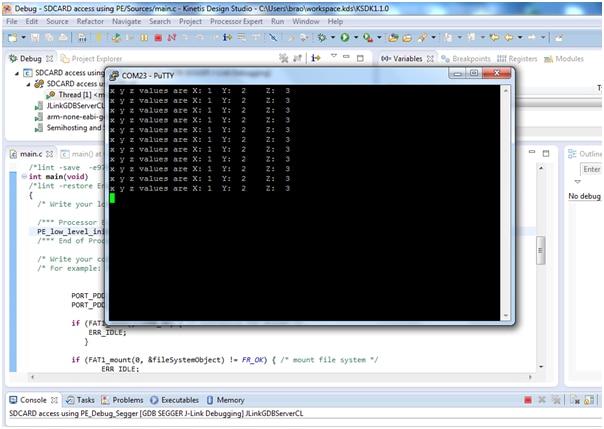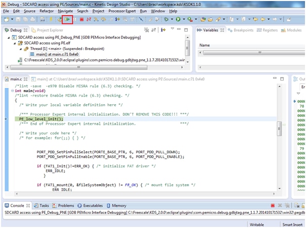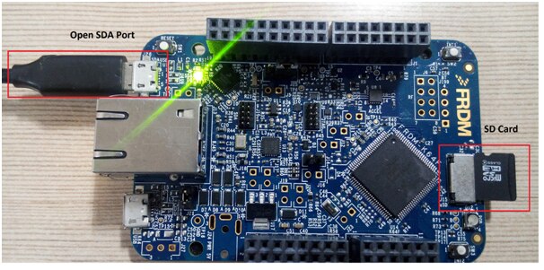 Now connect the K64 board to OPEN SDA port to your computer through USB cable, Then click on Debug button. And insert a SD-Card in the slot as shown below