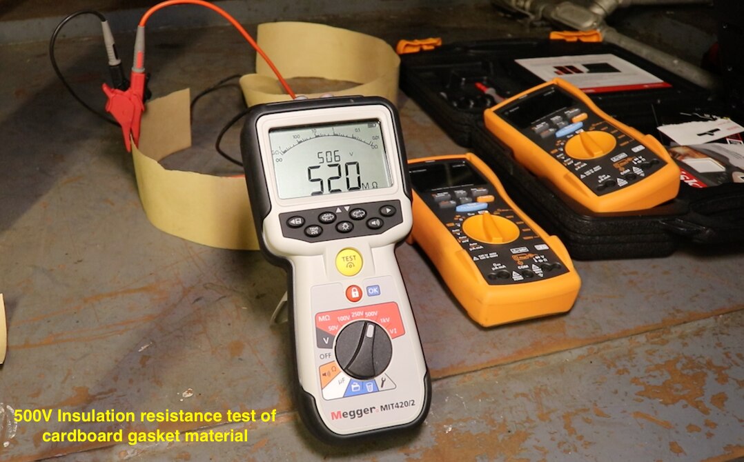 The test above shows a resistance of 520MOhm across one test point of the gasket material. The problem is that the material touches the forging and winding straps in multiple places, effectively giving multiple 520MOhm resistances in parallel, that ultimately lead to the perceived low readings of the winding.